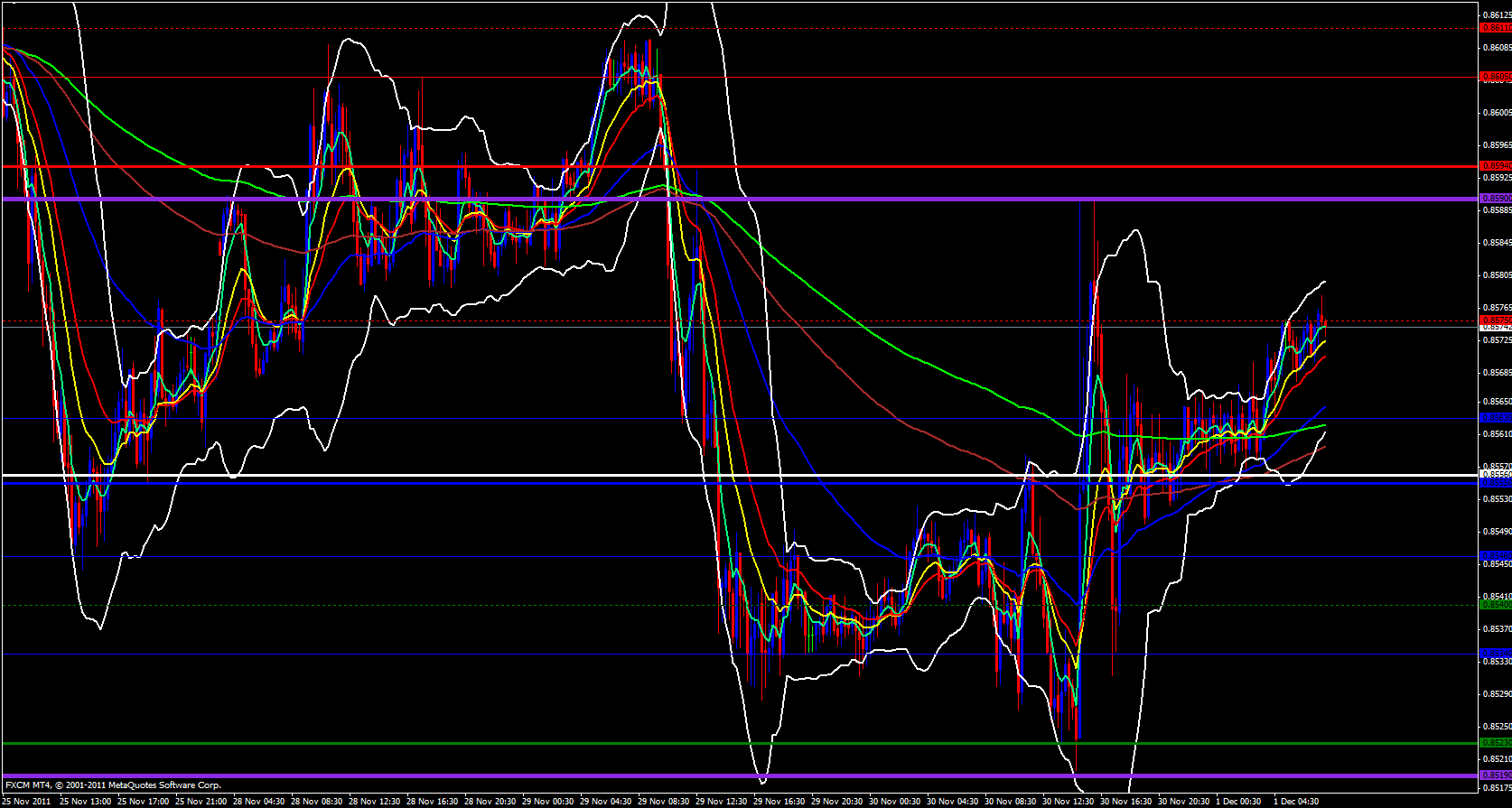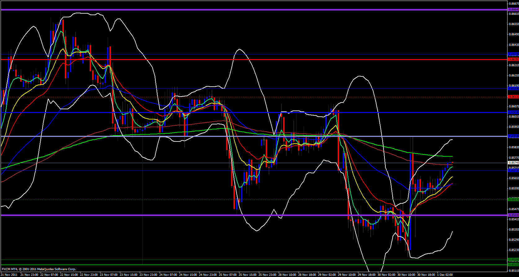 Finally on the 15 minute time frame price is riding the 21 ema. Current price is at .8575 and the next areas of resistance is yesterdays high which was .8590 and the weekly central pivot point is also at .8590 and the monthly M3 is at .8612