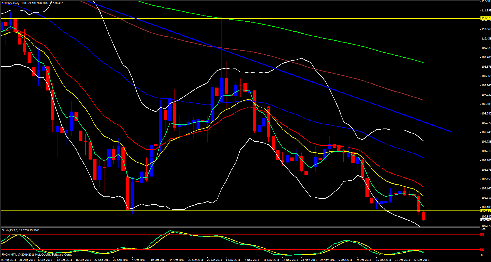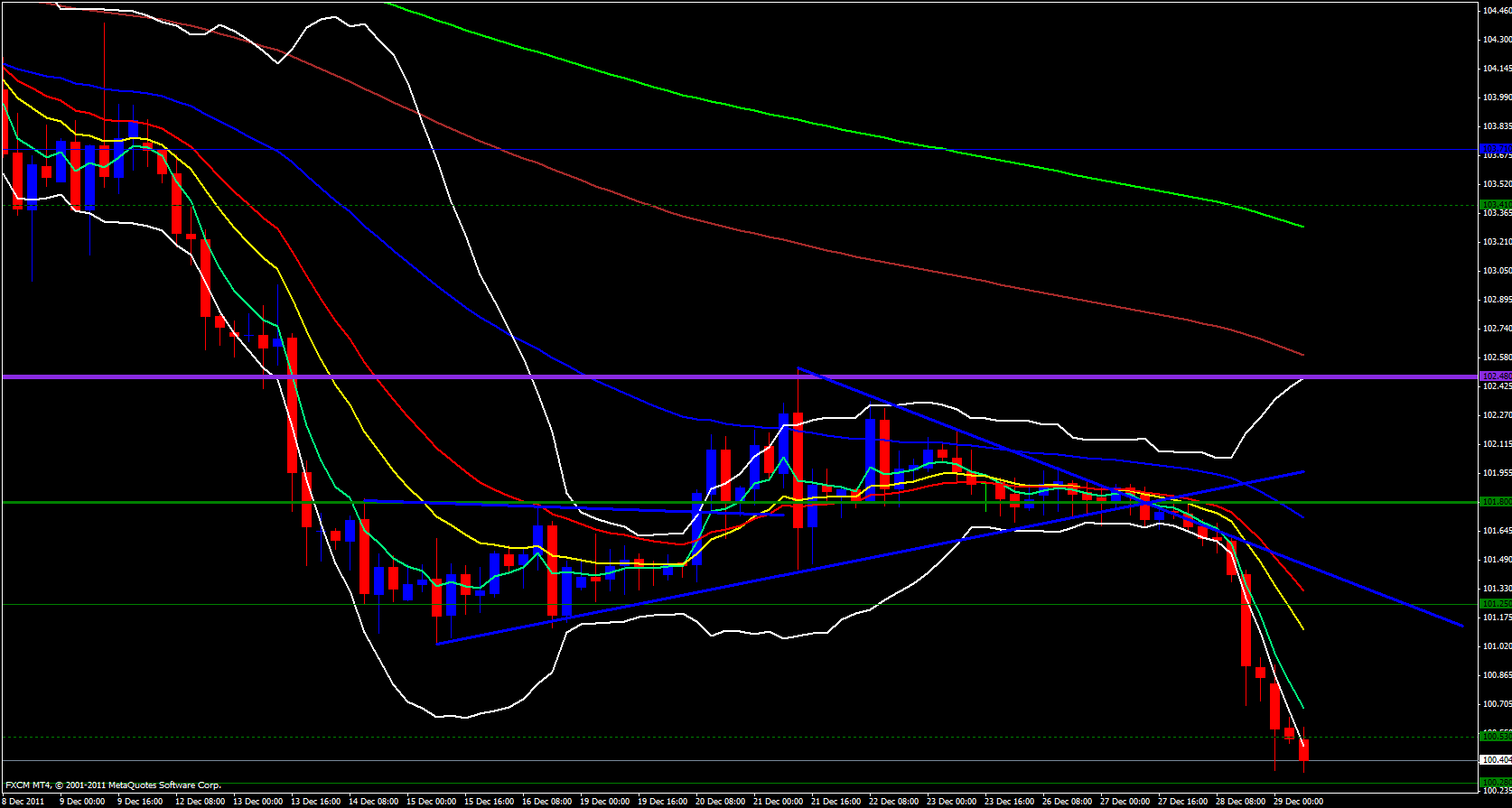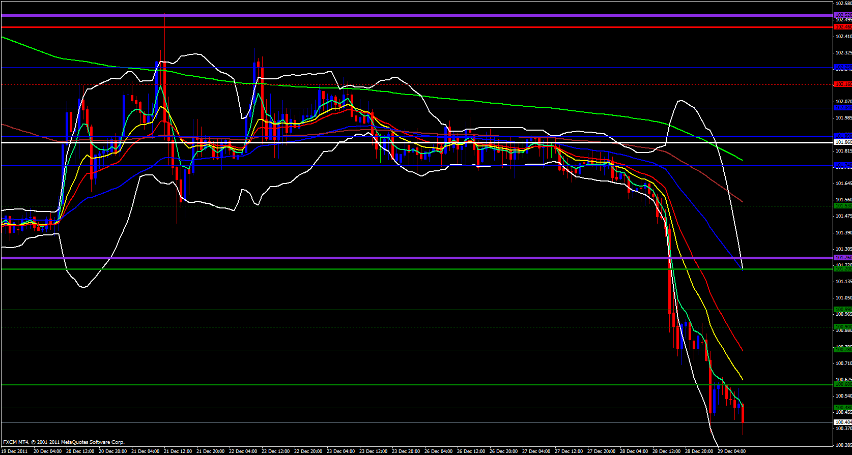 On the hourly timeframe price continues to fall and ride the 5 ema to the downside. I would like to see price retrace back up to the weekly S2 at 100.60 so that I can take a position short. At this time price has fallen too far too fast to grab a short, we need a retracement to a reasonable area of resistance to take this pair down further.