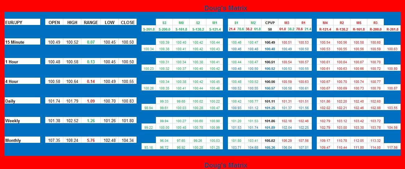 Finally, on the15 minute timeframe price is also extended outside the lower Bollinger band and price has already made its way below the daily S1 at 100.42 but I would like to see a retracement up to the 15 minute 21 ema around 100.50 to get in on this short and preferable as high as 100.65 which would be a kiss of the 15 minute 55 ema.