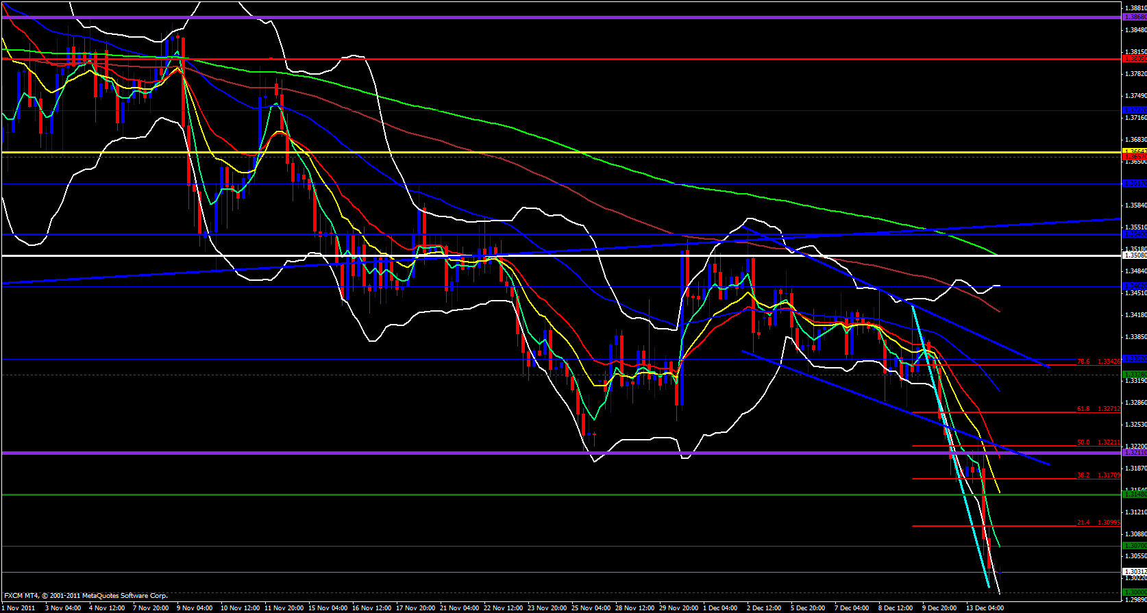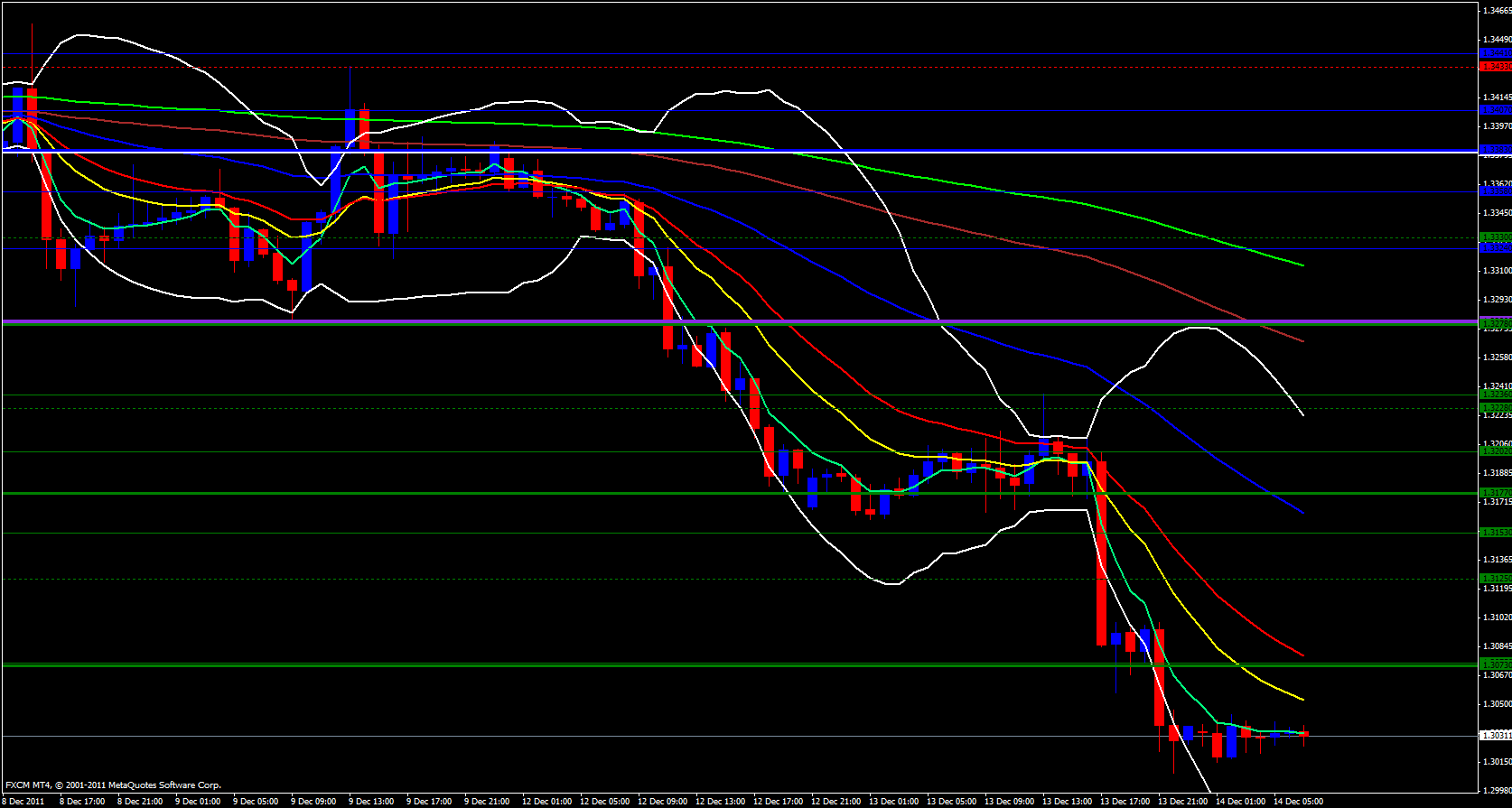 On the 4 hour time frame same story, way below the 5 ema and just coming of the lower Bollinger band. Price is also just above the monthly M1 pivot at 1.30 and on the weekly pivots price is beyond the S3 and today price is below the daily central pivot point but just above the daily M2 pivot at 1.3021 within a tight 15 minute Bollinger band squeeze that generally compresses price and causes it to take off under pressure in either direction.
