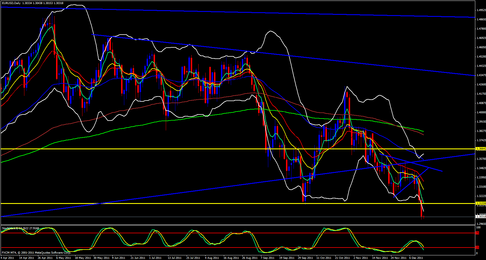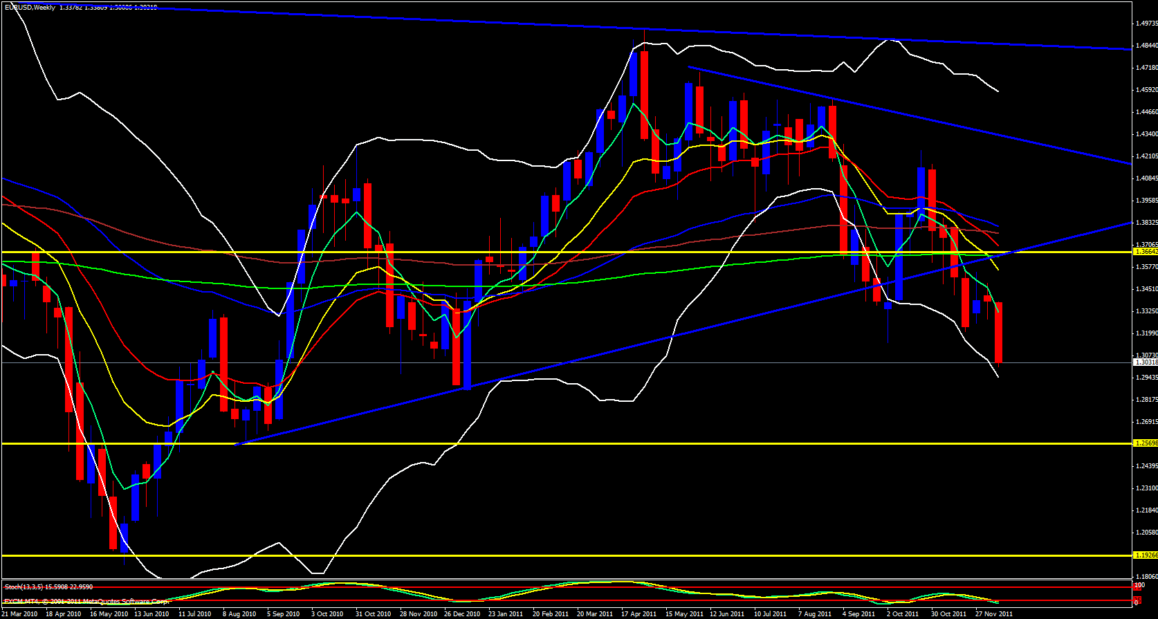 I will start out my analysis for the EUR/USD on the weekly time frame. I want to point out that after yet another very bearish move yesterday for this pair price is taken even further down away from the 5 ema but not it has touched the lower Bollinger band which could be the early heads up that price may soon snap back up to make contact with the 5 ema. The stochastics is also in the oversold zone.