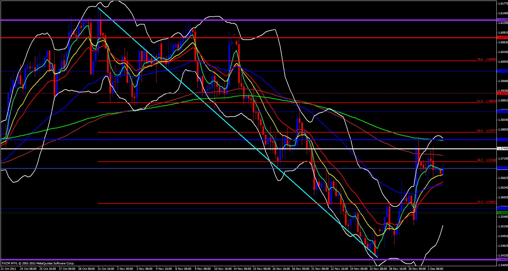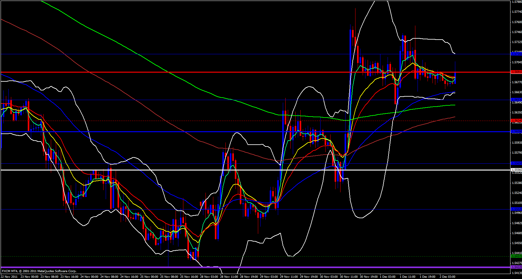 On the hourly time frame the Bollinger bands are closed and developing into a tunnel as it looks to me and the ema's are all coming together so obviously no real price action to speak of. Price is sitting on the weekly R1 pivot at 1.5691