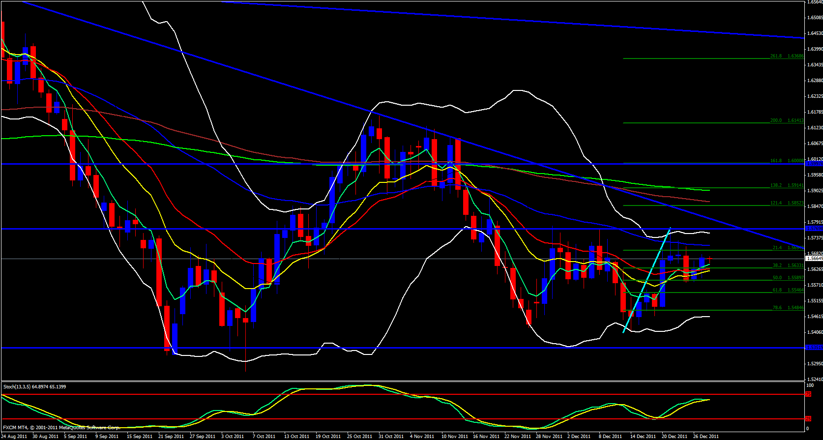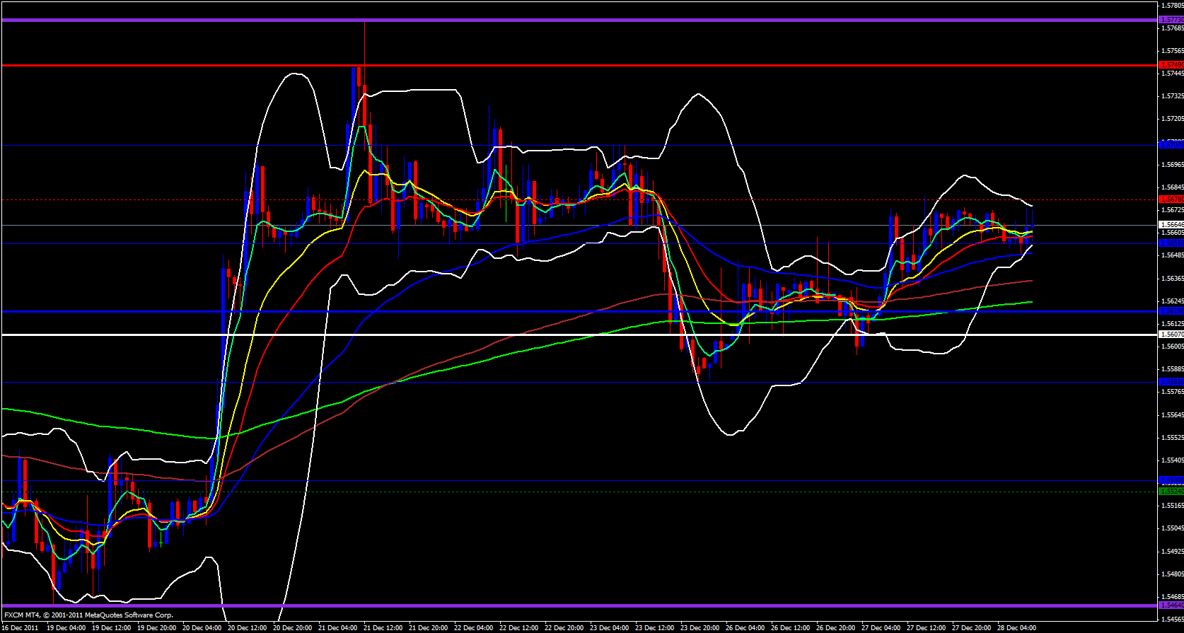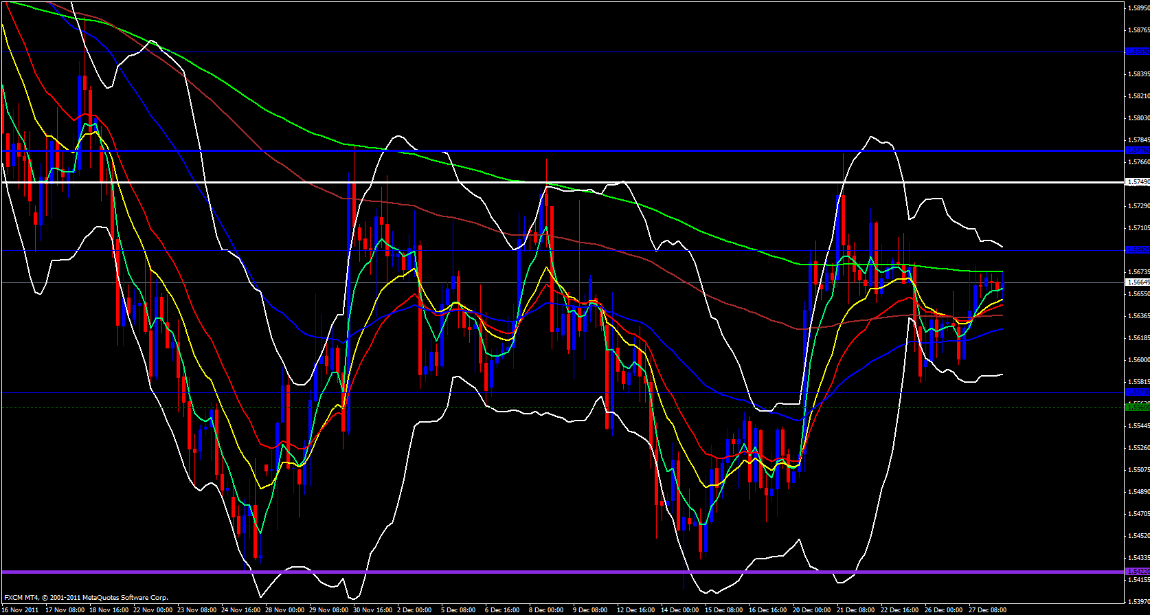 Looking at the 4 hour timeframe it is obvious that price is in a range and interesting enough price is at a 50.0 fib overlapped with a 233 ema and weekly M3 pivot at 1.5678 which is probably what has been keeping price down for the past 24 hours.