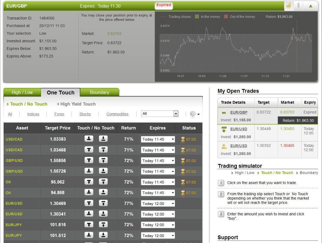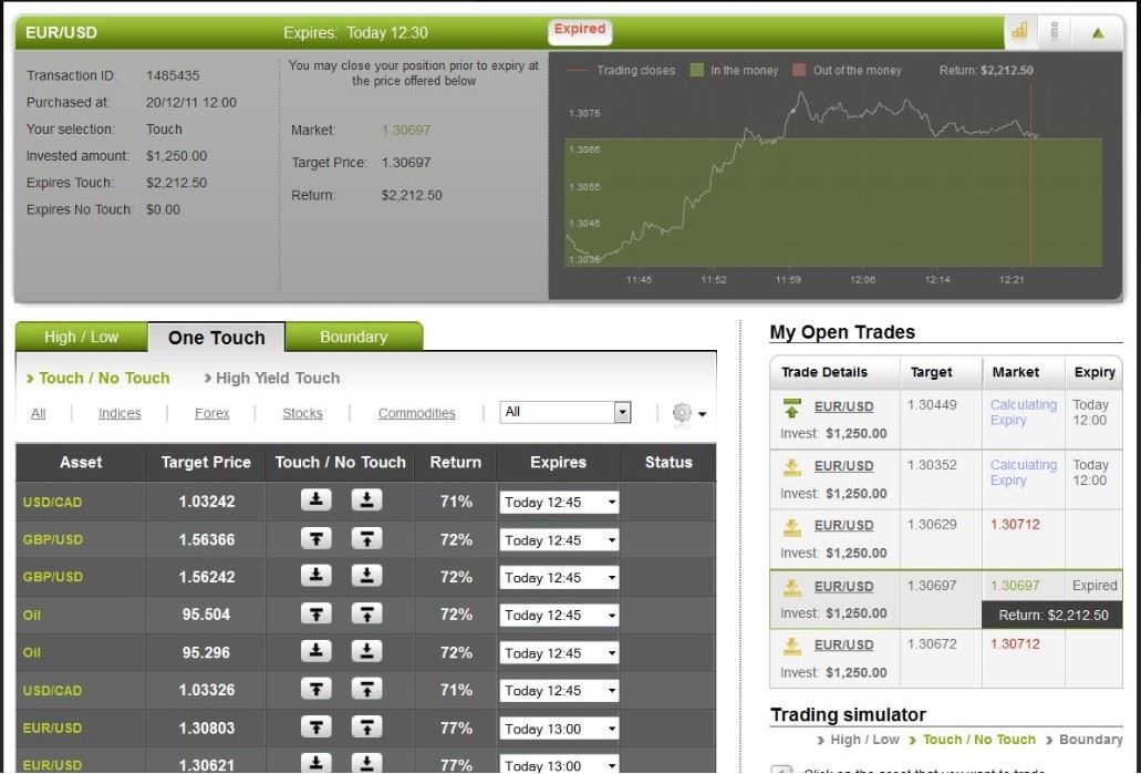 With optionFair™ Binary Options Trading Platform, I traded $1,250 on the “Touch Down” instrument. This kind of option has a return of 77% if the option touches the strike price prior to the expiration time. I could get a return of $962 on my investment.