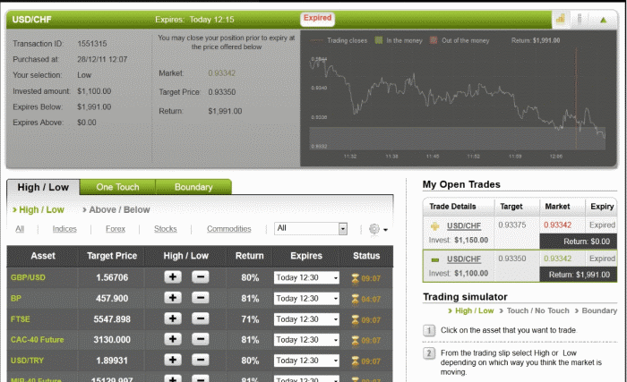 The market price for the pair at the buying time (12:02) was 0.93350 and at the expiry time (12:15) the market price was 0.93342, which is above the starting price therefore I won $891.