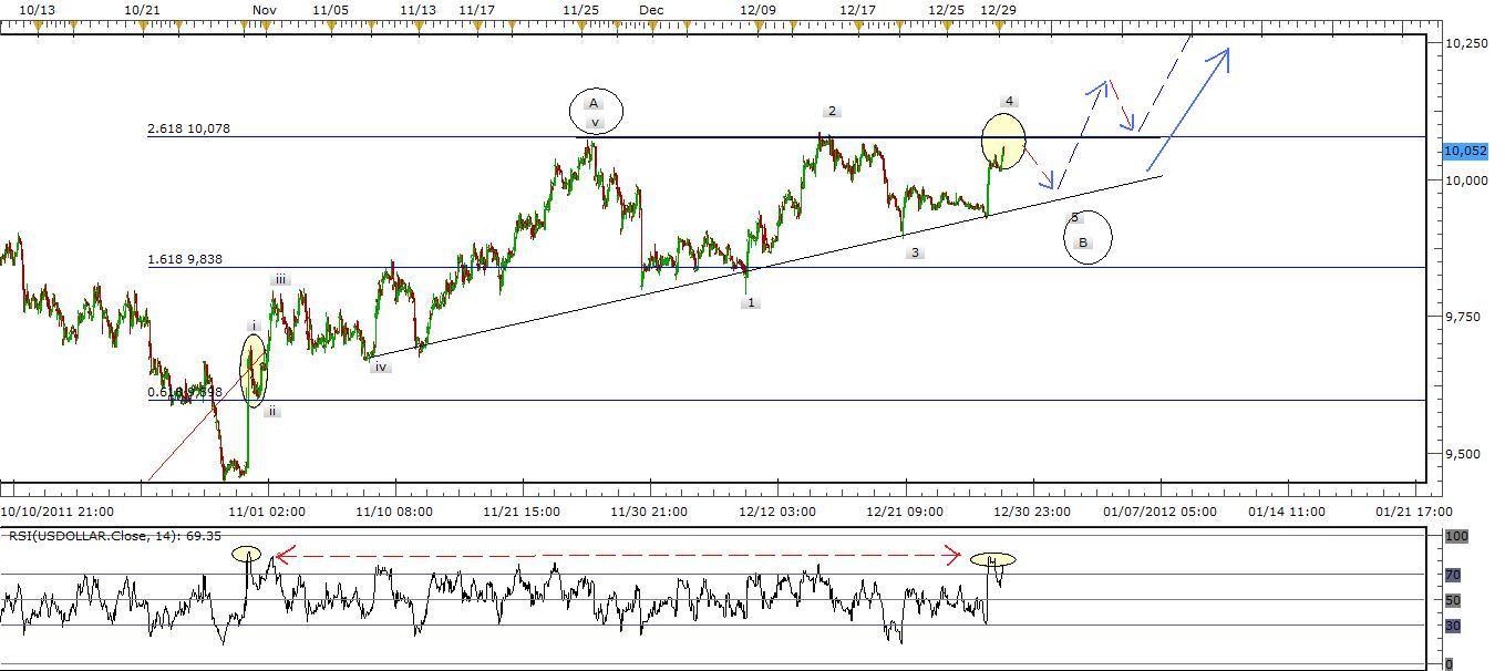 Description: It looks like a larger ABC correction. Wave A completed its v extension hitting 10,000 level or at 2.168 Fib level, and Ascending Triangle for wave B. Wave B is at its 4th and expected to drop to 5th at 9,970 for a completion. Wave C is expected to take off in Jan 2012. That will affect other currencies such as Euro, Yen, Swiss Frank and British Pound.