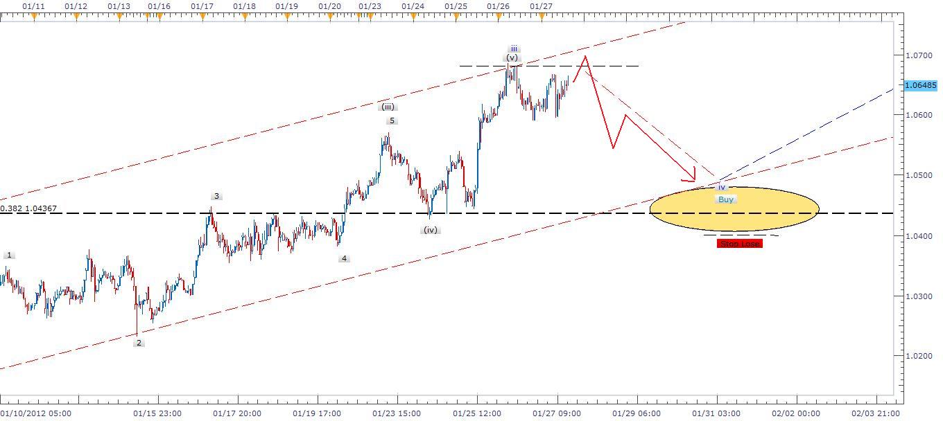 Description: Trend in Aussi just completed wave iii and expected a complex wave for next week down toward 0.318 Fibonacci level at price near 1.04500. We need to wait for more news to flow in on the pair. I would suggest in this stage of trading to step aside and watch the trend next week and to buy at best price which can be 1.0500. Anyways, I will watch the market and send you alert on next possible strategy for Aussi.