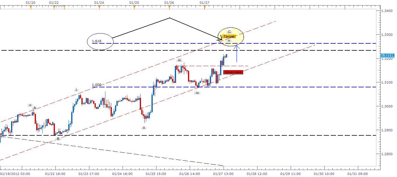Description: I will not get into economic figures here to justify my thought of the pair movement towards ABC equality but will wait for economic calender events next week. I still believe the pair is in final wave v up targeting 1.618 Fibonacci level at a target price 1.32600 or around it. That is possible for one day trade.