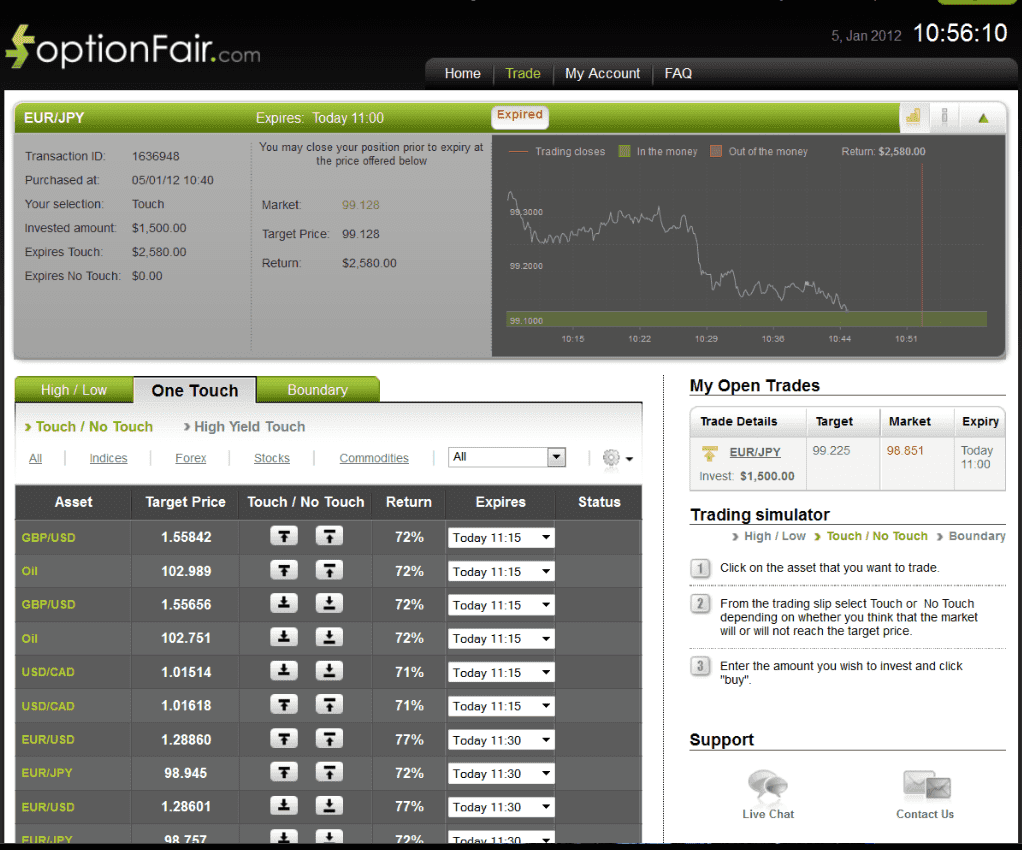 With optionFair™ Binary Options Trading Platform, I decided to trade with $1500. This kind of option has a return of 72% if the option touches the strike price prior to expiry, it means I’ll earn $1,030 on my investment. The market price for EUR/JPY hit the strike price at 10:45 and I won the position in just 5 minutes!
