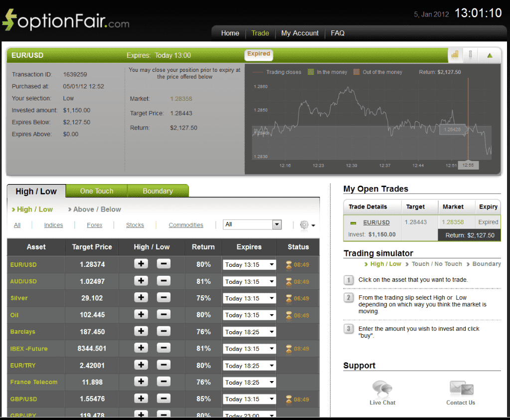 With optionFair™ Binary Options Trading Platform, I traded with $1,150 on the “Low” instrument. This kind of option has a return of 85% if the option expires below the strike price. The market price for EUR/USD at the buying time (12:52) was 1.28443 for the 13:00 expiration. The option expired at 1.28358, and I won the position giving me a $977 profit on my investment.