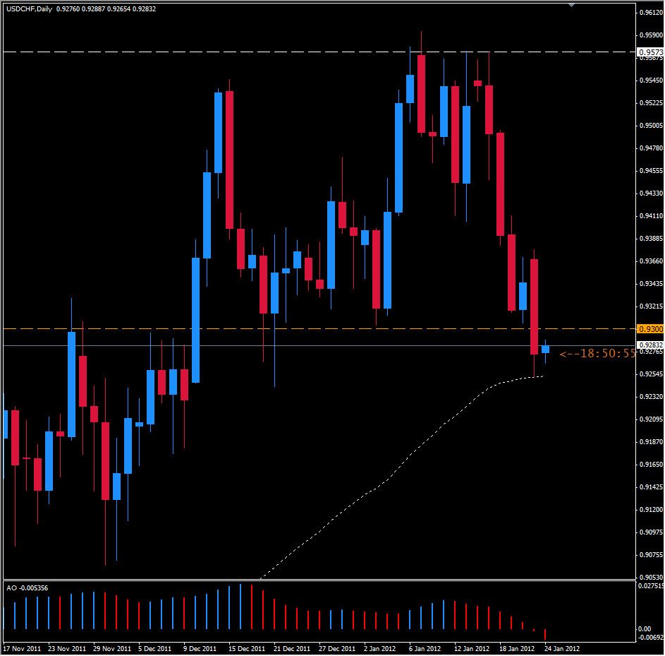 Combine the fact that last week's weekly candle was more or less a Bearish engulfing candle, and the correlation between some of the pairs, plus the close below 0.9300 I am Bearish on this pair. I expect to see support at 0.9160 and 0.9080 tomorrow with resistance sitting at 0.9360 and 0.9410 if the Bulls break through 0.9300. Ultimately I see this pair hitting 0.9000 soon, possibly by the end of the week.