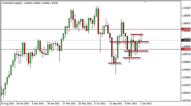 USD/CAD initially fell during the week as the oil markets have been very active. The Iranians are threatening to close the Strait of Hormuz in reaction to a boycott by the Europeans of Iranian oil. The oil markets are very volatile at the moment, and the USD/CAD follows this pattern. However, the weekly movement formed a hammer that showed support at the 1.01 level. The 1.01 level has been supportive before, and the hammer suggests that we are looking at higher prices. There is a larger triangle being formed, and a break above the downtrend line is bullish, while a break below would have to fight the support levels at 1.01, parity, and 0.99 going forward.