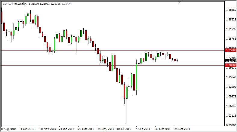 EUR/CHF finished the weekly basically unchanged. However, the weekly chart doesn’t give the action its due justice – it was choppy. The pair has the “floor” put in by the Swiss National Bank at the 1.20 level, and the 1.25 level has continued to keep the pair down. The 1.25 level is a major resistance area, and one would have to think that the European Union would have got its act together in order to want to buy the Euro for any real length of time. However, the 1.25 level being broken would be a career-making trade for the long-term. If we break below the 1.20 level, the Swiss National Bank will intervene. I am currently buying dips on shorter time frames in this pair, but only with small position size.