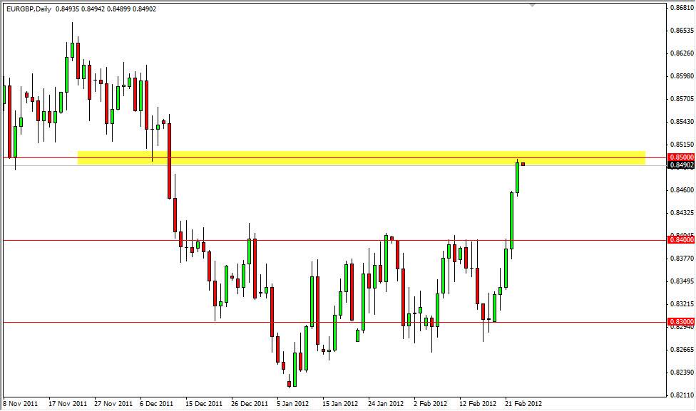The 0.85 level is a much more important resistance level than the 0.84 was. Granted, the 0.84 level held firm for quite some time, and the move since has been directly northbound, but the overall market looks at 0.85 with more confidence as based upon longer term charts.