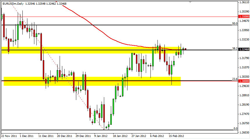 The 1.3250 area has been pierced several times now, but continues to hold firm as resistance. The area also has the 100 day EMA and the 38.2% Fibonacci retracement hanging about as well. The level is in my opinion, the start of a lot of resistance going all the way up to the 1.35 level. I know that the Euro can continue to rise, but I believe the path of least resistance is to the down side at this point. It must be said however, there is always someone willing to come in and try to push this pair up though.