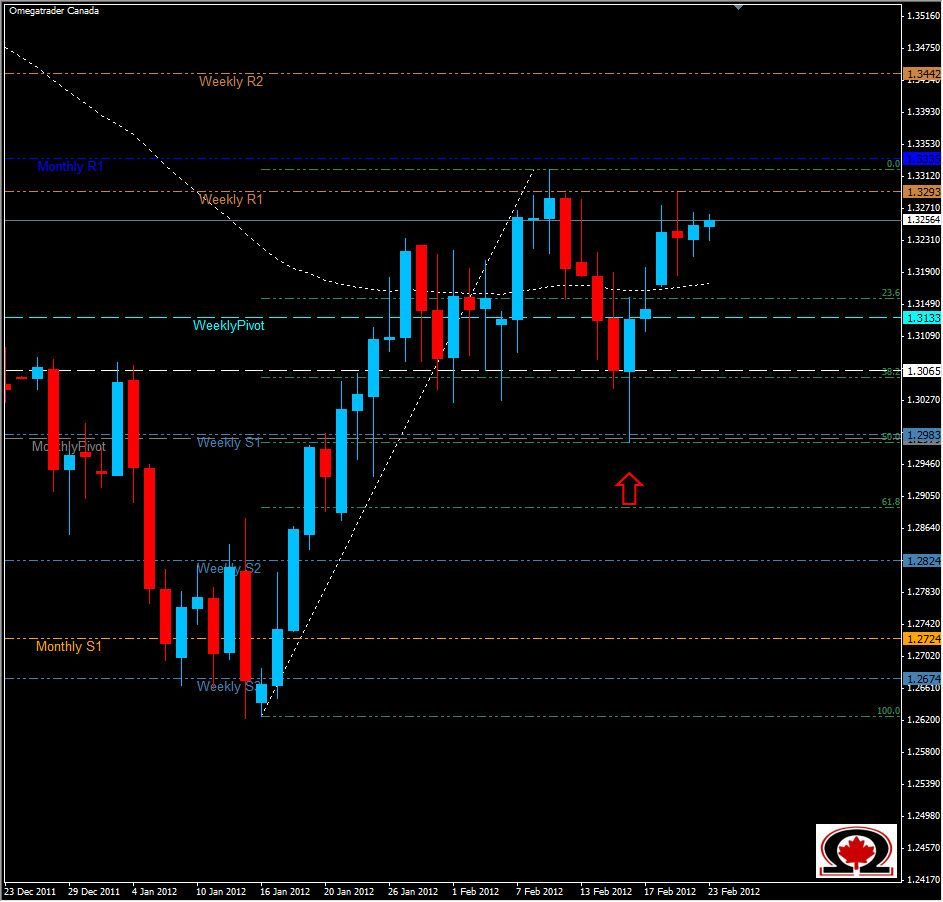 On February 16 the Euro touched the 50% retracement level from its reversal on January 16 to the 60 day high at 1.3320 and has now worked its way back up towards that high. Yesterday, the pair touched the Weekly R1 at 1.3293 and backed off closing much lower that day. In today's trading, the Euro showed slightly bullish action and appears to be continuing that trend for the time being. At the time I write this, the pair is testing the Daily R! at 1.3273, breaking a Flag Formation on the 4 hour chart. Price will need to break 1.3293 and hold above to continue what the bears have started. Farther up we see more resistance at 1.3335, a monthly resistance zone and then a straight shot up to 1.3442. To the downside there is support at 1.3242 and 1.3218 with 1.3133 acting as the weekly pivot and additional support. I am Bullish on this pair, especially so once we break above 1.3321.