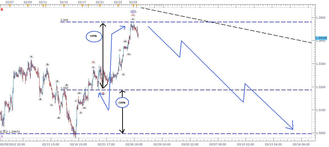 Description:As posted last week we hit the target level as expected with a larger Zigzag in a falling channel as shown in chart. Wave A= 100% of wave B and I marked this move as wave D. What is expected after this move is a major fall in currency with a five waves down. I am short now and keeping my eye on the Economic Calender for updates. A minor correction might follow today or tomorrow but the major move is expected down.