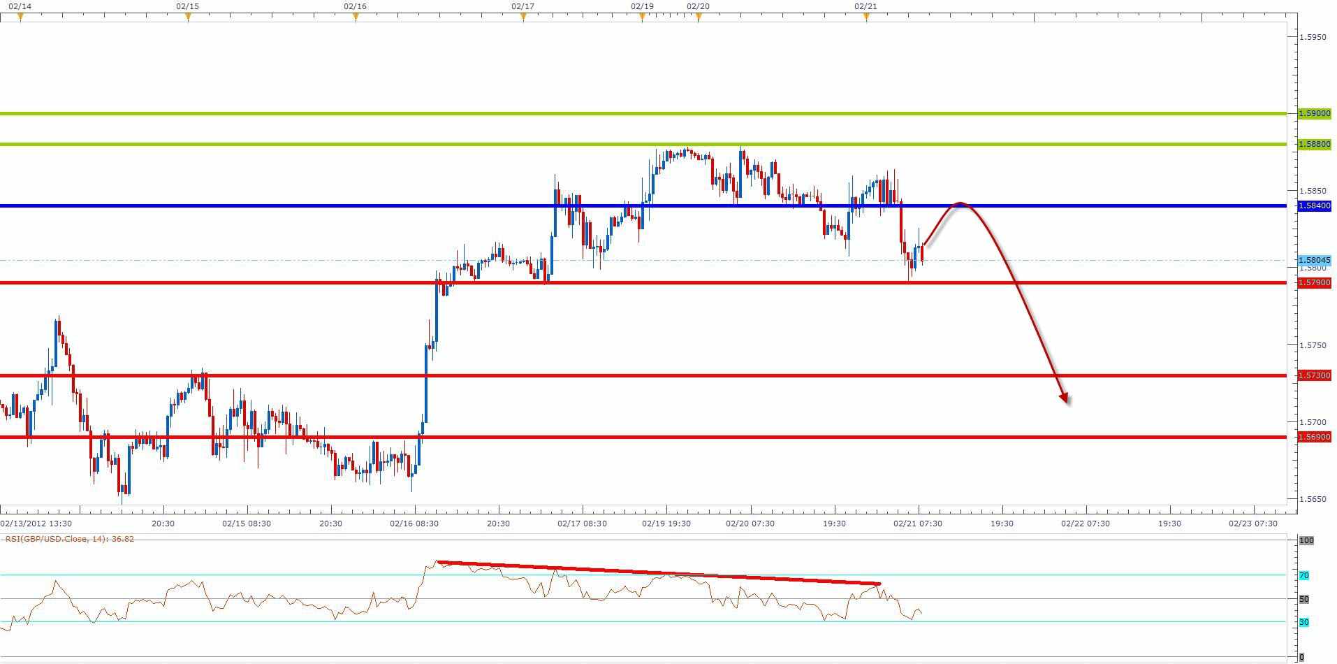 Description: We see that the GBP/USD is under the pivot point ( 1.5840 ) and the RSI reached the resistance line. We expect more downtrend towards 1.5790- the first support level and a breakthrough will confirm more downtrend until 1.5730.