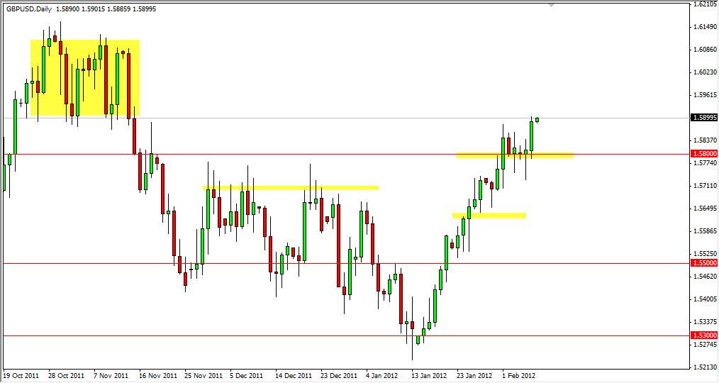The British Pound has skyrocketed in value lately, barely pausing to stop as it climbs against the Dollar. In this backdrop, it has been difficult for many traders to get involved as it simply seems to have “run away”. The short pause at 1.58 really was insignificant in comparison to the massive spike we have seen over the last three weeks or so.