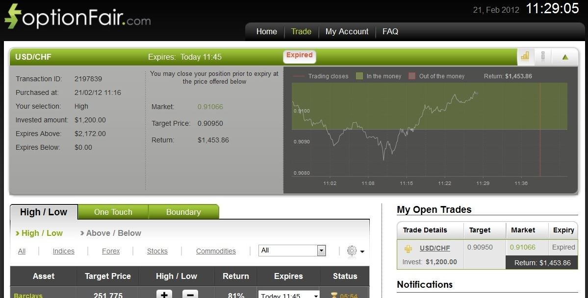With the optionFair™ Binary Options Trading Platform, I wanted to invest with $1,200 on the “High” instrument in hopes of making a profit of $972 on the trade. This kind of option has a return of 81% if the option expires above the strike price. The market price for USD/CHF at the buying time (11:16) was 0.90950. Although the option was moving in the right direction, I decided to use the early closure option prior to expiry time and collect some of the profits, not taking a chance on sudden changes. In this particular case I’ve earned $253 in less than 13 minutes, which I was very satisfied about.