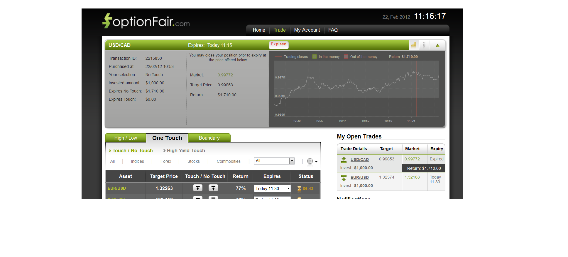 With optionFair™ Binary Options Trading Platform, I traded $1000 on the “No Touch down” instrument. This kind of option has a return of 71% if the option doesn’t touch the strike price till the expiration time therefore I could get a return of $710 on my investment. The market price for USD/CAD at the buying time (10:53) was 0.99699 and the strike price for the expiration of 11:15 was 0.99653.