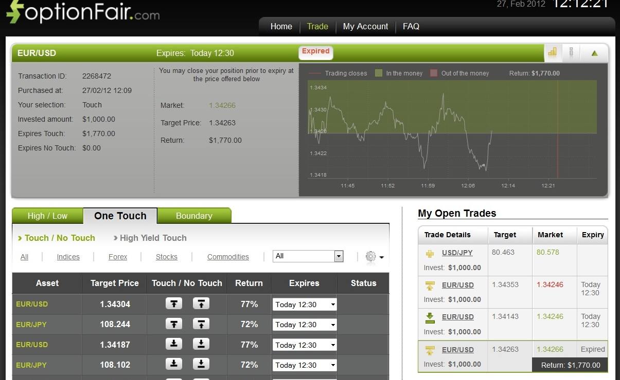 With optionFair™ Binary Options Trading Platform, I traded $1,000 on the “Touch” instrument. This kind of option has a return of 77% if the option touches the strike price prior to the expiry. The market price for the EUR/USD at the buying time (12:09) was 1.34204 and the target price was 1.34266. At 12:11 the market hit my target price and I won $770 in 2 minutes. Very quick and easy way of making lots of money.