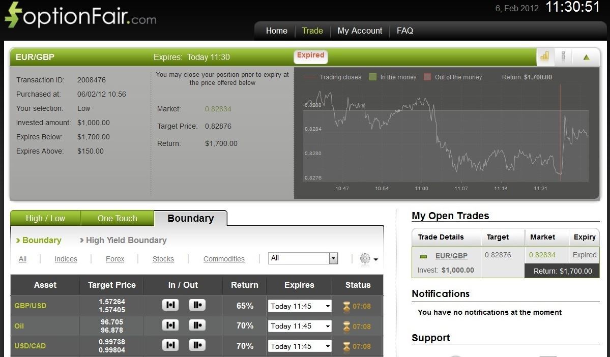 The target price for the EUR/GBP at the buying time (10:56) was 0.82876 and at the expiry time (11:30) the market price was 0.82834, which is above my buying and I won $700.