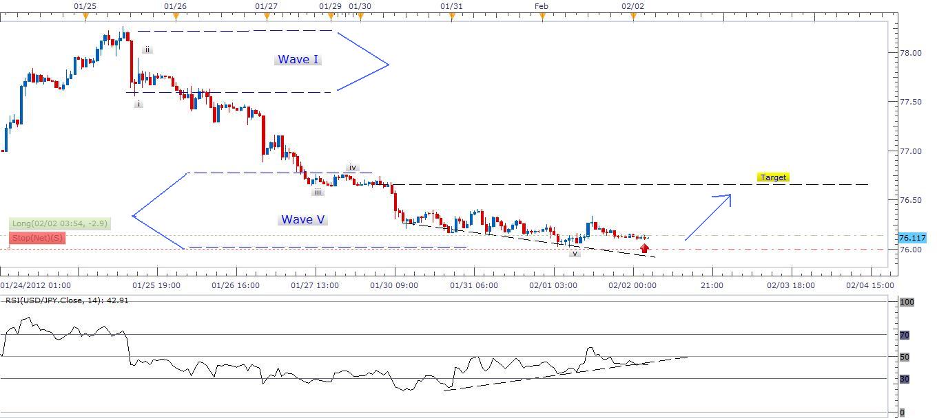 Description: Divergence in RSI along with equality in wave (I=V) as shown in chart. I expect an up move to follow the divergence with a correction targeting wave ii of V. I will leave the target open waiting the correction to form and Economic news to come in. My position is long now.