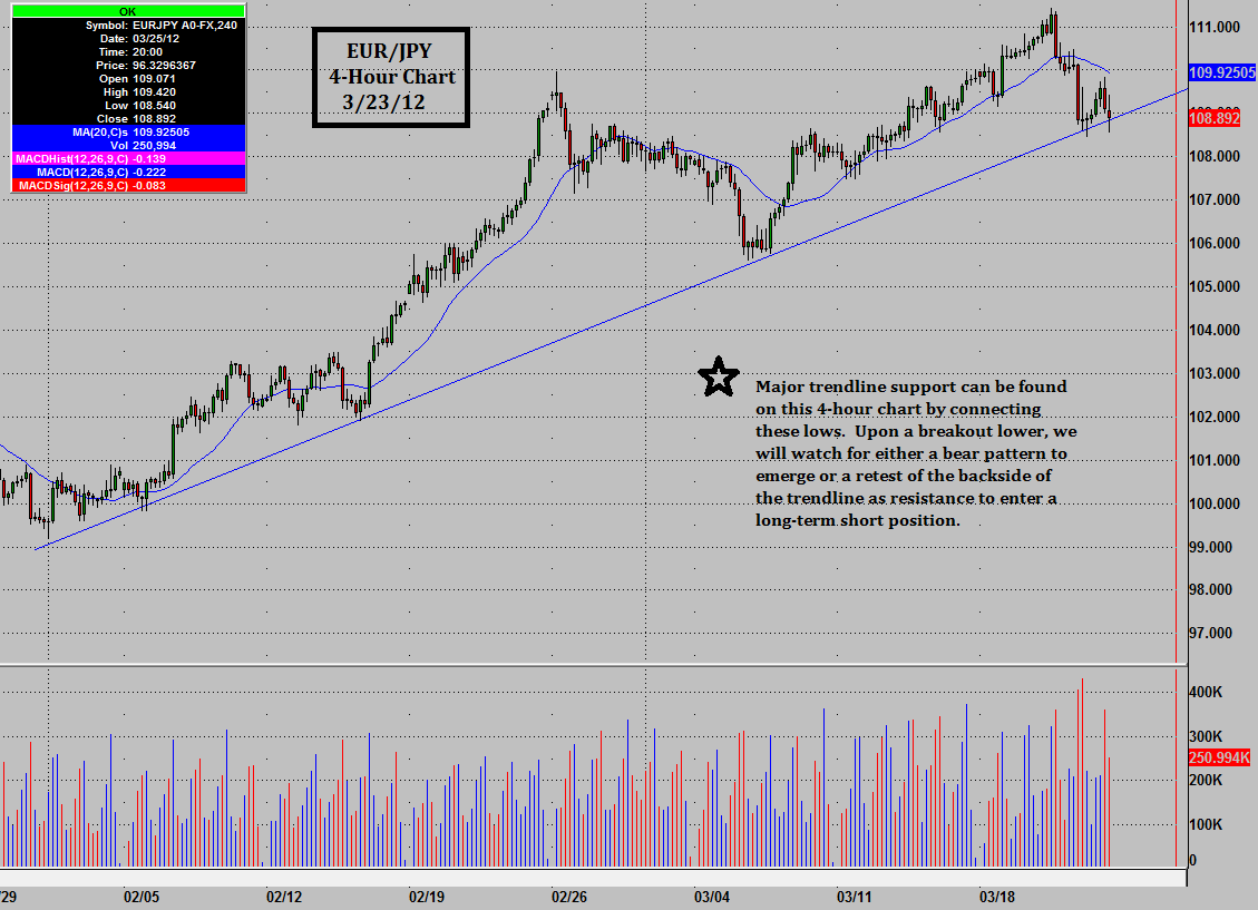 Setup: Given the over-extension of the JPY pairs, we have been looking for opportunities to profit off a possible correction. EUR/JPY is currently trading right at a trend-line that can be seen by connecting the lows of a 4-hour chart. We will patiently watch for a potential trend-line break lower and look for a bear pattern to emerge OR a retest of the backside of the channel as resistance.