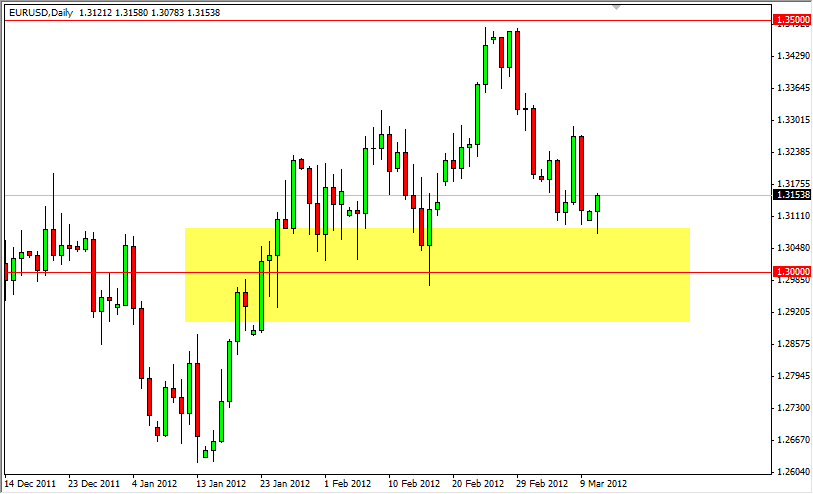 The 1.31 level mentioned above is the start of significant support, and it looks as if it goes all the way down to the 1.29 handle. While a 200 pip zone is a large area to worry about, it really isn’t that unprecedented as the markets will often have larger than normal support and resistance levels at areas that are of major importance. This is the question that we are trying to answer right now: Is the Euro strong enough fundamentally to be over the 1.30 mark? There are a lot of reasons why it wouldn’t be, and I believe that eventually it will be proven to be so. However, in the mean time we need to work with the charts we are given.