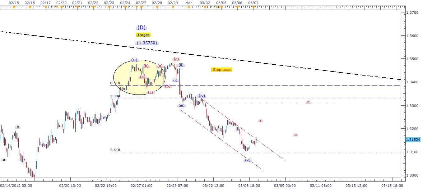 Description: End of first wave toward 1.20 level. A short risky correction will progress after ending diagonal just hit 2.618 Fibonacci level as shown on chart. Usually I don't trade such a patterns but for traders who love risky trades would enjoy such a scenario. This is a short term trade last for a day or two.