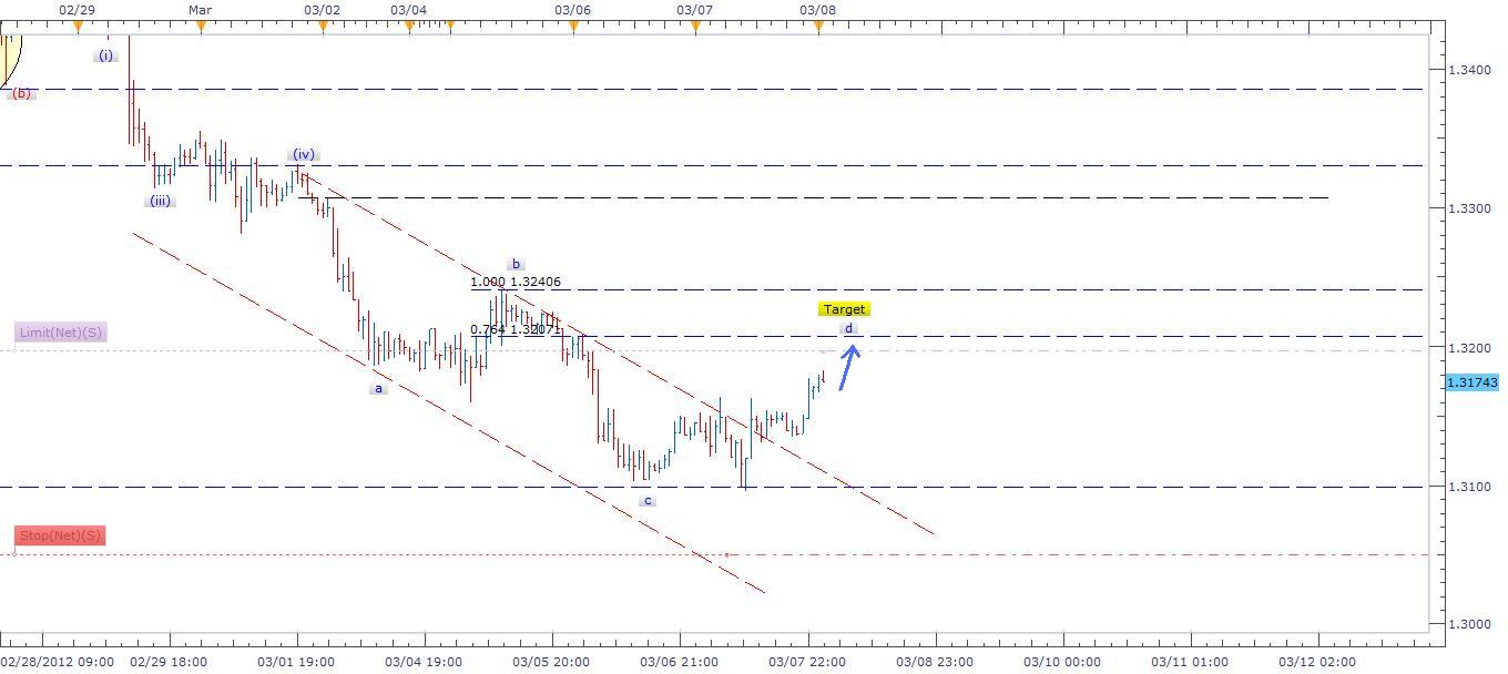 Description: Follow up on my yesterday trade, I suggest my followers to close the long position or to wait until it comes close to 1.31950. I do feel another drop is coming on the way if wave five was en Ending Diagonal. I marked the current wave as of d which retrace 0.768 of previous c. Let's close with about 80 pips profit and watch the next move in the market.