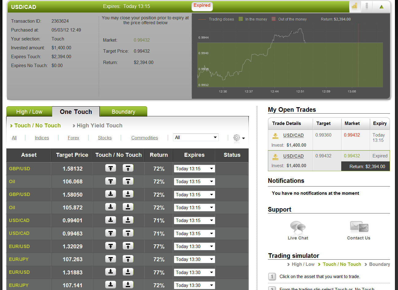With optionFair™ Binary Options Trading Platform, I traded $1,400 on the “Touch Down” instrument. This kind of option has a return of 71% if the option touches the strike price prior to the expiry. The market price for the USD/CAD at the buying time (12:49) was 0.99464 and the target price for 13:15 expiry was 0.99432. The pair touched the strike price at 12:53 and I won my position within 4 minutes giving me $994!