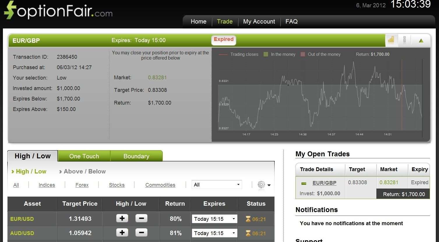That means that if the signal is correct, I could get a return of $700 on my investment. The market price for the EUR/GBP at the buying time (14:27) was 0.83308. The expiration took place at 15:00 at the price of 0.83281, below the strike price which earned me 70% on my $1,000 investment.