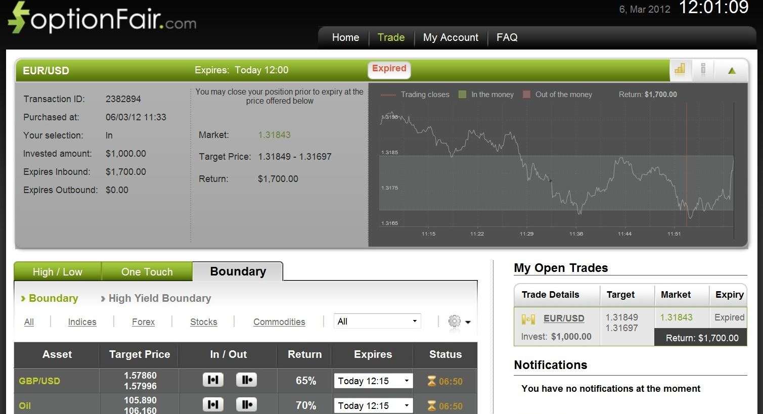 I logged into the optionFair™ Binary Options Trading Platform and I traded with $1,000 on the “In” instrument. This kind of option has a return of 70% if the option will expire in the boundary, which means that if the signal is correct, I could get a return of $700 on my investment.