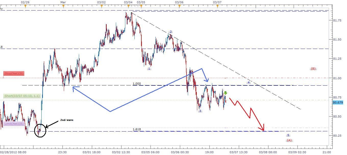 Description: A falling correction starting with first wave (A). Within wave (A) trend completed wave 3 and wave 4 is in progress in a complex pattern comparing to wave 2 a simple one. Falling wave 3 broke the support at 80.90 which became a resistance at this point of time pushing the trend toward final wave 5 of (A) at 1.618 Fibonacci level. I shorted the pair at this point of complex wave waiting for wave five to unfold soon.