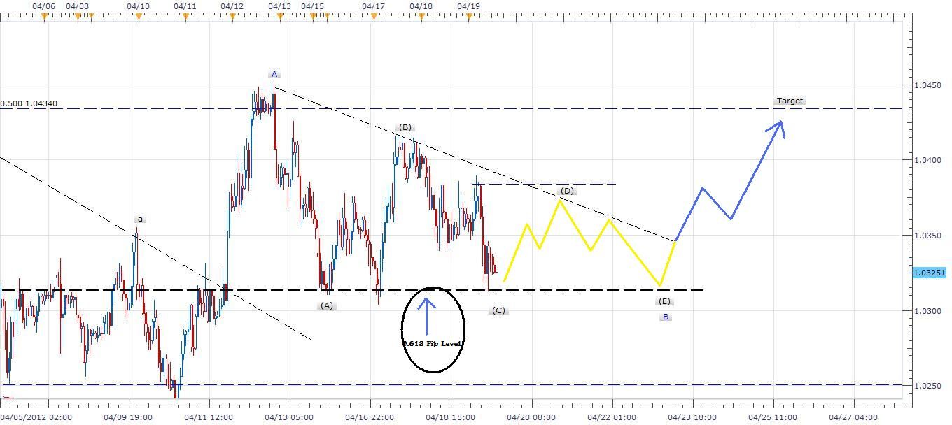 Description: After the break in the falling Zigzag that breaks on 11 April at price 1.03144 going up to 1.0450 and back down testing 1.03130 at .0618 Fib level and since that trend formed a descending triangle as shown on chart. A range bound level will remain until a breakout comes sometime next week targeting 1.04300 level before the major trend change direction. I suggest you to hold your long position.