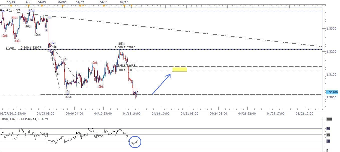 Description: Again with over sold level in Relative Strengths and cross above the 30 (Blue Circle), and the expected news about dropping in Advance Retail Sales which might reflect on US Dollar, I do expect a bounce in EUR/USD to a certain level although I am not sure about the upcoming pattern. The trade could be risky one at the moment, but in days to come, we can recognize the direction on the trend. I am targeting 0.5 Fibonacci level.