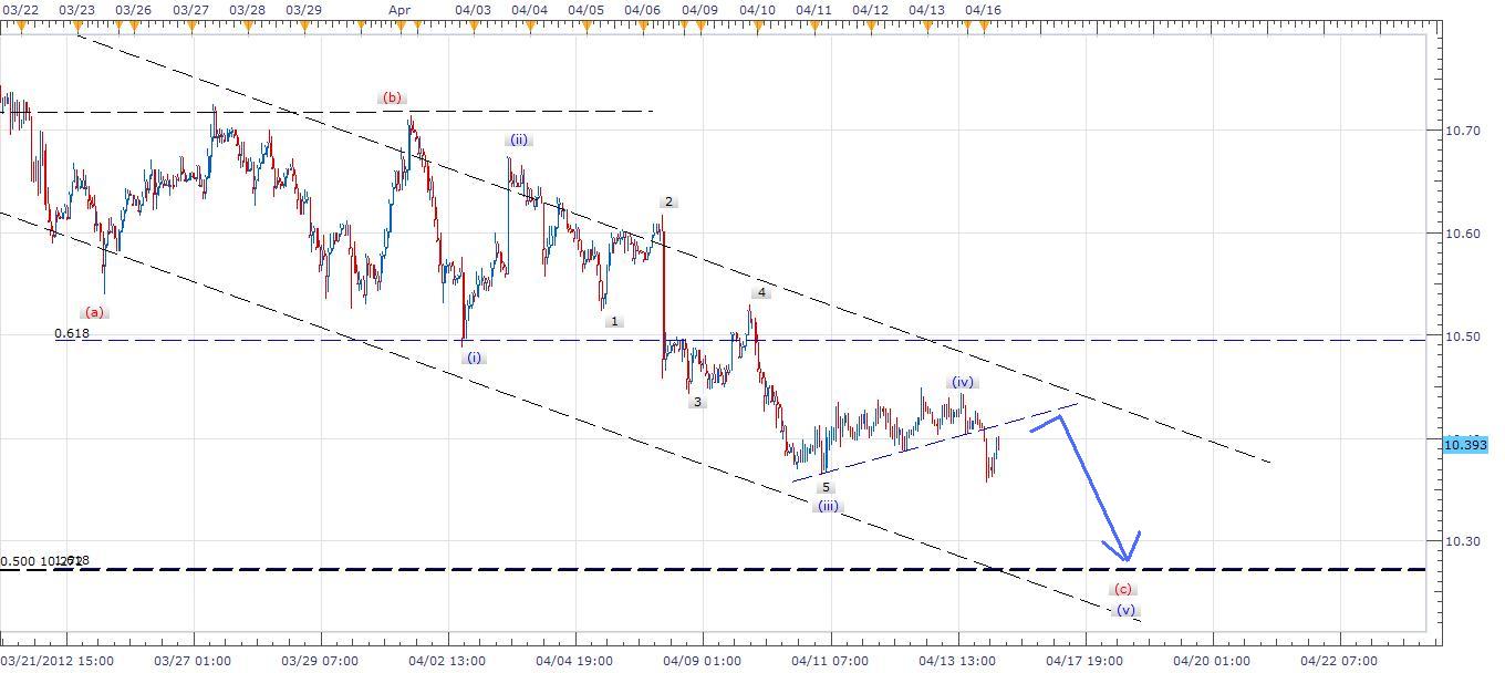 Description: With a positive signs on Japanese Yen and Japanese economy, I do expect a fall in Hong Kong Dollar against the Japanese Yen. Looking technicality on falling channel that wave 5 of iii has been completed at 10.366 and wave iv is in progress and broke the upward trend line, I still do expect a further drop toward 0.5 Fibonacci level toward a target of 10.280 to unfold final wave v of a larger cycle C. Let's maximize the benefit of a pull back below trend line under a complex correction for a taste from Asia.