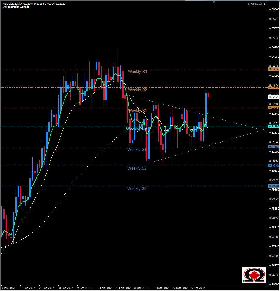 The Kiwi aka NZD/USD has been trading in an increasingly tighter range of 200 +/- pips for over 5 weeks now. Today the New Zealand Dollar gained 125 pips on the Greenback and broke out of this range closing well above the Weekly R1 and coming within 10 pips of the Weekly R2 all in one daily candle. Now that the upper descending trend-line has been broken with strength, expect a pullback, possibly to the 0.8230 level before advancing further. It is possible however, that the pair may simply consolidate in the final hours of this week's trading and not move substantially until the markets re-open next week. If price does continue its Bullish advance, Resistance will be found at 0.8313 and then the Daily R1 which sits currently at 0.8357. Support for the pair is at 0.8290, 0.8268 and 0.8220 sits down below. While there are not Asian Market fundamentals outstanding, there are 3 high impact events for the Greenback on Friday including CORE CPI, U of M Consumer Sentiment, and Bernanke is going to be dispensing his trademarked brand of verbal jargon as well mid morning in New York. As always use caution if you are trading around these events.