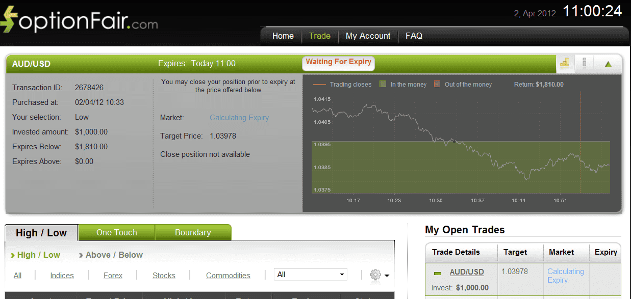 I logged into the optionFair™ Binary Options Trading Platform at 10:33 and I traded $1,000 on the “Low” instrument. This kind of option has a return of 81% if the option expires under the strike price at expiry time, which means I’ll earn $810 on my investment.