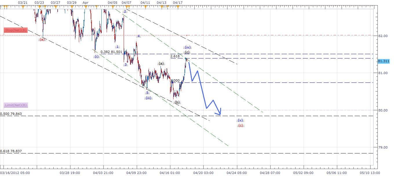 Description: A flat correction just ended at 81.5 at 2.618 Fib level in a position of wave (iv) near 0.382 of from the larger second cycle. Price shouldn't exceed 81.5. Wave (v) is on the way to unfold targeting 80.00. Japanese Merchandise Trade Balance is expected to increase from 29.4B to 223.2B which might also pull the pair down to 80.00 level. I already short the pair targeting wave (v).