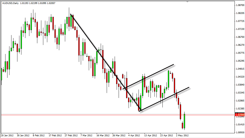 The Aussie gapped lower at the open for Monday as the world sold off risk assets in reaction to the election results in places like Greece, Germany, and France. The austerity packages are now in some kind of doubt, so this of course had the markets a bit jittery. This doesn’t surprise me as the Aussie is so highly correlated to the commodity markets and gold especially.