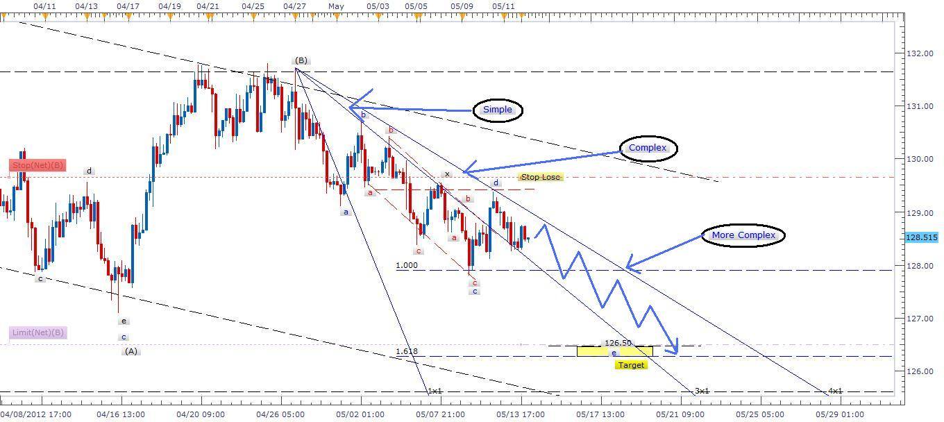Description: As trend going through wave C to complete 100% of previous ZigZag where wave C got into a triple smaller corrections that I marked them as Simple, Complex, and I expect a more complex smaller correction on the way going down through 126.500 level. This trade will take sometime probably a week or so going slowly to its target due to itscomplexity.