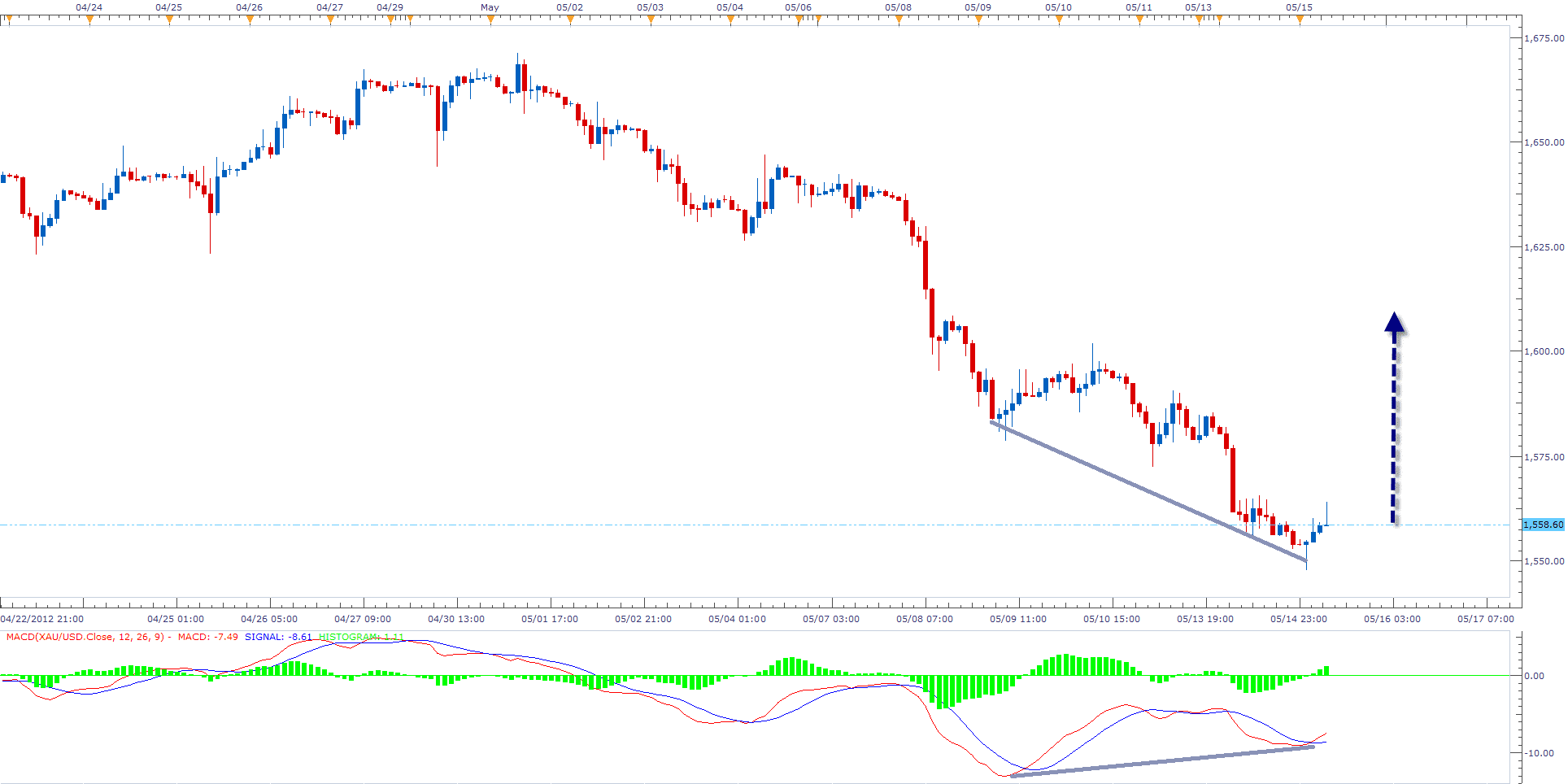 Description: The XAU/USD is currently forming a MACD convergence , as we can notice , the MACD shows possible convergence and the MACD line crossed the MACD signal line.