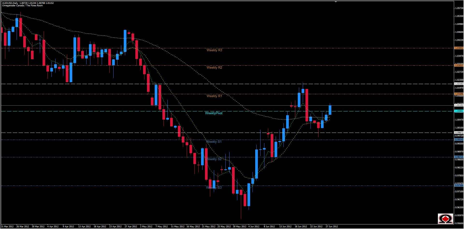 The Australian Dollar continues to gain against the Greenback during Asian trading with a high at time of writing of 1.01244. The Bullish Flag formation that we spoke of previously appears to be valid as price has now pushed above the Weekly Pivot at 1.0088 but is hitting resistance at some previous lows from May 6 & 7. If it can push through this resistance, the next hurdle will be the Weekly R1 at 1.0169 and then a consolidation zone at 1.0216 where the pair will most surely pause, if not reverse. However, the market has not yet opened in London, and as many know price often trades in the opposite direction during Asian trading than it does during the higher volume markets in London & New York. If this is the case, we may actually see the bears take over later today and see price fall back below the Weekly Pivot. A daily Pin Bar from this level could easily signal lower prices and gains by the USD which would bring price back down to support at 0.9987 which sits just above the also relevant support level of 0.9954. With investors slowly migrating away from the EURO back to the USD as a 'safe haven' as it has been called, this is entirely possible by the end of the week.