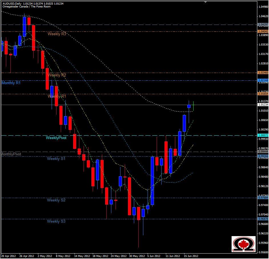 The AUD/USD continues to steadily climb away from the low it established at the beginning of June after pausing at par for a few days. Now the pair is within reach of the next major resistance level at 1.0246 where it has clearly established a level of Support & Resistance. This level also coincides with the 50% retracement level for the bearish trend over the last 3 months, and will be a great place for traders to consider short positions again. There are some hurdles in the way however with resistance also seen at 1.0165 & 1.0217. Price has also now closed above the 62 EMA suggesting momentum has shifted to longer term Bullish momentum, so use caution if shorting and holding for any length of time. To the downside, we see support at the 38.2% level of 1.0066, the Weekly Pivot at 1.0007 and Monthly Pivot/Weekly S1 at 0.9930 +/- a few pips.