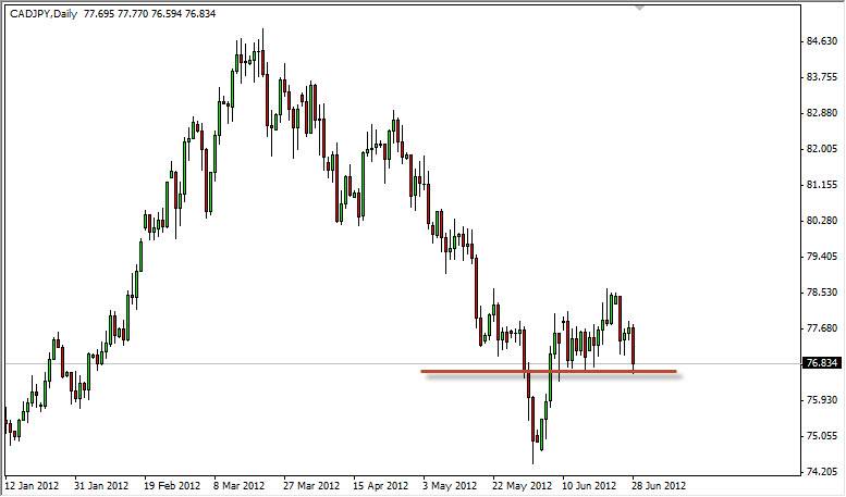 As for breakdown, on a break of the Thursday lows I believe that this market will plummet to the 74.50 level or so before running into any serious support. Quite frankly, this is the move I'm hoping for as it is the most profitable one. If we can manage to get a close on the daily chart above the 78.50 level, I would consider buying this pair on that move. Until then, I'm selling this pair using the above listed parameters.