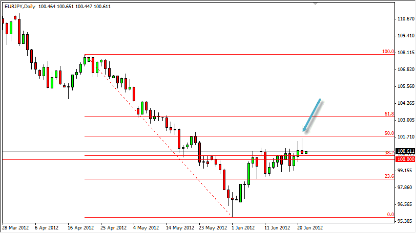 EUR/JPY has been in a massively bearish trend for some time now. However, over the last month or so, we have seen a bit of a rally. The real question when something like this happens is whether or not it is a rally, or merely a pullback. With the Euro, for some reason, hope burns eternal and it is a currency that simply won’t roll over at times. Think of it this way: If the drama that we have seen lately in Europe had gone on in Mexico – where do you think the Peso would be right now?