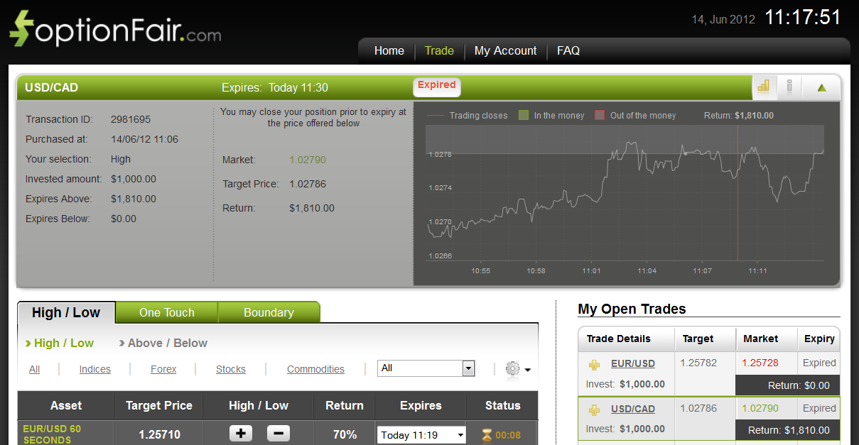 I logged in the optionFair™ Binary Options Trading Platform and I traded $1,000 on the “High” instrument. This kind of option has a return of 81% if the option expires above the strike price, meaning if the signal is correct I could get a return of $810 on my investment.